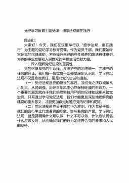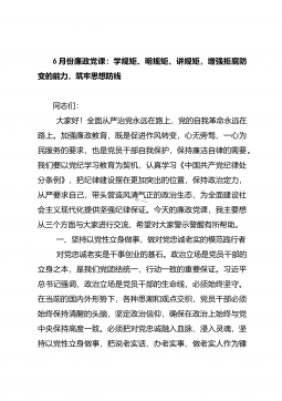 6月份廉政党课:学规矩、明规矩、讲规矩,增强拒腐防变的能力,筑牢思想防线同志们:大家好!全面从严治党永远在路上,党的自我革命永远在路上。加强廉政教育,既是促进作风转变,心无旁骛、一心为民服务的要求,也是党员干部自我保护,保持廉洁自律的需要。我们要以党纪学习教育为契机,认真学习《中国共产党纪律处分条例》,把纪律建设摆在更加突出的位置,保持政治定力,从严要求自己,带头营造风清气正的政治生态,为全面建设社会主义现代化提供坚强纪律保证。今天的廉政党课,我主要想从三个方面与大家进行交流,希望对大家警示警醒有所帮助。一、坚持以党性立身做事,做对党忠诚老实的模范践行者对党忠诚老实是干事创业的基石。政治立场是...