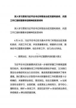深入学习贯彻习近平总书记听取自治区党委和政府、兵团工作汇报时重要讲话精神的发言材料深入学习贯彻习近平总书记听取自治区党委和政府、兵团工作汇报时重要讲话精神的发言材料8月26日,习近平总书记在乌鲁木齐专门听取自治区党委和政府、兵团工作汇报,并发表重要讲话。根据研讨方案,围绕总书记重要讲话精神,结合本职工作,谈几点认识体会。一、提高站位,充分认识总书记重要讲话的重大意义习近平总书记的重要讲话为进一步做好新疆工作擘画蓝图指引航向,既对新疆各项工作取得的成绩给予肯定,又为我们落实社会稳定和长治久安总目标、推进高质量发展提供了根本遵循。我们要充分认识到党中央对新疆各项工作的要求是十分明确的,关键要领会到...
