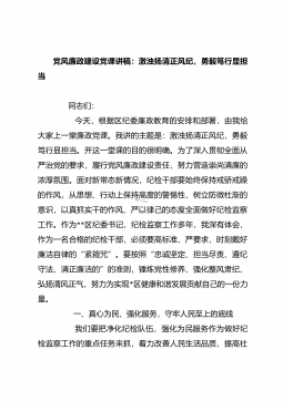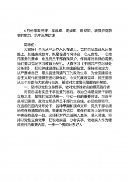 6月份廉政党课:学规矩、明规矩、讲规矩,增强拒腐防变的能力,筑牢思想防线同志们:大家好!全面从严治党永远在路上,党的自我革命永远在路上。加强廉政教育,既是促进作风转变,心无旁骛、一心为民服务的要求,也是党员干部自我保护,保持廉洁自律的需要。我们要以党纪学习教育为契机,认真学习《中国共产党纪律处分条例》,把纪律建设摆在更加突出的位置,保持政治定力,从严要求自己,带头营造风清气正的政治生态,为全面建设社会主义现代化提供坚强纪律保证。今天的廉政党课,我主要想从三个方面与大家进行交流,希望对大家警示警醒有所帮助。一、坚持以党性立身做事,做对党忠诚老实的模范践行者对党忠诚老实是干事创业的基石。政治立场是...