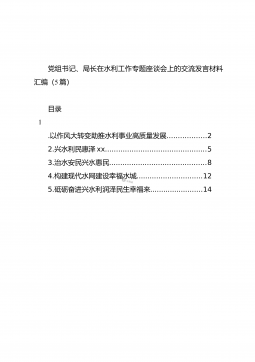 党组书记、局长在水利工作专题座谈会上的交流发言材料汇编(5篇)目录1.以作风大转变助推水利事业高质量发展..................22.兴水利民惠泽xx..............................................53.治水安民兴水惠民............................................84.构建现代水网建设幸福水城..............................125.砥砺奋进兴水利润泽民生幸福来........................14每日公文网meirigongwen.com每日公文网站VI...
