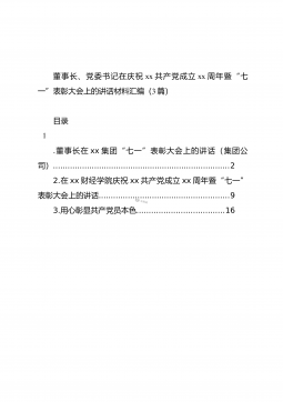 董事长、党委书记在庆祝xx共产党成立xx周年暨“七一”表彰大会上的讲话材料汇编(3篇)目录1.董事长在xx集团“七一”表彰大会上的讲话(集团公司).........................................................................22.在xx财经学院庆祝xx共产党成立xx周年暨“七一”表彰大会上的讲话......................................................93.用心彰显共产党员本色....................................16翰林公文网hanlingo...