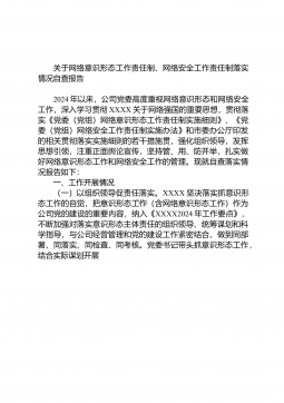 关于网络意识形态工作责任制、网络安全工作责任制落实情况自查报告2024年以来,公司党委高度重视网络意识形态和网络安全工作,深入学习贯彻XXXX关于网络强国的重要思想,贯彻落实《党委(党组)网络意识形态工作责任制实施细则》、《党委(党组)网络安全工作责任制实施办法》和市委办公厅印发的相关贯彻落实实施细则的若干措施贯,强化组织领导,发挥思想引领,注重正面舆论宣传,坚持管、用、防并举,扎实做好网络意识形态工作和网络安全工作的管理。现就自查落实情况报告如下:一、工作开展情况(一)以组织领导促责任落实。XXXX坚决落实抓意识形态工作的自觉,把意识形态工作(含网络意识形态工作)作为公司党的建设的重要内容,...
