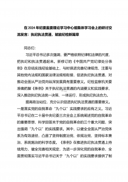 在2024年纪委监委理论学习中心组集体学习会上的研讨交流发言:执纪执法贯通,赋能纪检新篇章同志们:习近平总书记多次强调,要严格依照纪律和法律的尺度,把执纪和执法贯通起来。新修订的《中国共产党纪律处分条例》在总结实践经验基础上,与时俱进完善纪律规范,注重与其他党内法规和国家法律法规相衔接,促进执纪执法贯通,对推动全面从严治党向纵深发展具有重要意义。纪检监察机关要准确把握《条例》关于执纪执法贯通的内涵要义和实践要求,深入推动执纪执法统一决策、一体运行,形成执纪执法合力。提高政治站位,充分认识促进执纪执法贯通的重要意义。一是落实党的自我革命“九个以”实践要求的应有之义。习近平总书记在二十届中央纪委三...