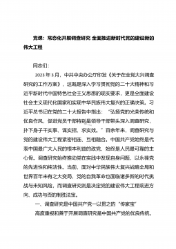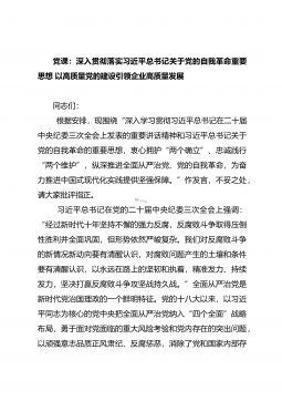 党课讲稿:深入学习习近平总书记关于党的自我革命的重要思想持续以恒推进全面从严治党向纵深发展同志们:习近平总书记在二十届中央纪委三次全会上发表的重要讲话,总结了全面从严治党的新进展、新成效,明确提出推进党的自我革命“九个以”的实践要求,对持续发力、纵深推进反腐败斗争作出战略部署。习近平总书记在重要讲话中把“坚持一体推进不敢腐、不能腐、不想腐”列为新征程反腐败斗争总的要求的重要内容,充分表明一体推进不敢腐、不能腐、不想腐,不仅是反腐败斗争的基本方针,也是新时代全面从严治党的重要方略。全面从严治党永远在路上,党的自我革命永远在路上。新征程上,要深入学习贯彻习近平总书记重要讲话精神和习近平总书记关于党...