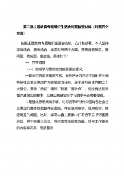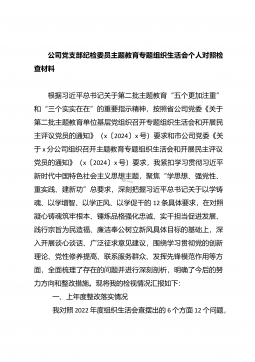 公司党支部纪检委员主题教育专题组织生活会个人对照检查材料根据习近平总书记关于第二批主题教育“五个更加注重”和“三个实实在在”的重要指示精神,按照省公司党委《关于第二批主题教育单位基层党组织召开专题组织生活会和开展民主评议党员的通知》(x〔2024〕x号)要求和市公司党委《关于x分公司组织召开主题教育专题组织生活会和开展民主评议党员的通知》(x〔2024〕x号)要求,我紧扣学习贯彻习近平新时代中国特色社会主义思想主题,聚焦“学思想、强党性、重实践、建新功”总要求,深刻把握习近平总书记关于以学铸魂、以学增智、以学正风、以学促干的12条具体要求,在对照凝心铸魂筑牢根本、锤炼品格强化忠诚、实干担当促进...