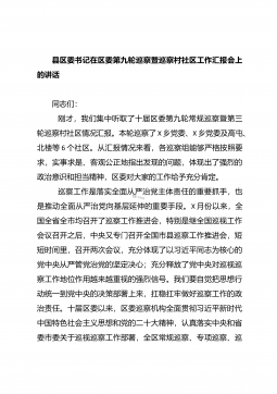 县区委书记在区委第九轮巡察暨巡察村社区工作汇报会上的讲话同志们:刚才,我们集中听取了十届区委第九轮常规巡察暨第三轮巡察村社区情况汇报。本轮巡察了X乡党委、X乡党委及高屯、北楼等6个社区。从汇报情况来看,各巡察组能够严格按照要求,实事求是、客观公正地指出发现的问题,体现出了强烈的政治意识和担当精神,区委对大家的工作给予充分肯定。巡察工作是落实全面从严治党主体责任的重要抓手,也是推动全面从严治党向基层延伸的重要手段。X月份以来,全国全省全市均召开了巡察工作推进会,特别是继全国巡视工作会议召开之后,中央又专门召开全国市县巡察工作推进会,短短时间里,召开两次会议,充分体现了以习近平同志为核心的党中央从...