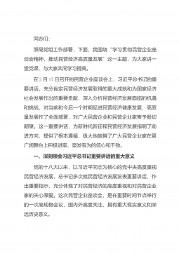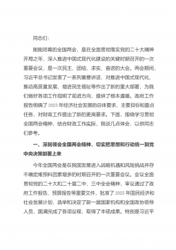 同志们:刚刚闭幕的全国两会,是在全面贯彻落实党的二十大精神开局之年、深入推进中国式现代化建设的关键时期召开的一次重要会议,是一次民主、团结、求实、奋进的大会。两会期间,习近平总书记发表了一系列重要讲话,对推进中国式现代化、推动高质量发展、增进民生福祉等作出了新的重大部署,为我们做好各项工作指明了前进方向、提供了根本遵循。政府工作报告明确了2025年经济社会发展的总体要求、主要目标和重点任务,对财政工作提出了新的更高要求。下面,围绕学习贯彻全国两会精神,结合财政工作实际,我谈几点体会,以供同志们参考。一、深刻领会全国两会精神,切实把思想和行动统一到党中央决策部署上来今年全国两会是在我国发展进入战...