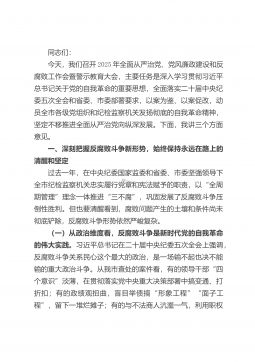 同志们:今天,我们召开2025年全面从严治党、党风廉政建设和反腐败工作会暨警示教育大会,主要任务是深入学习贯彻习近平总书记关于党的自我革命的重要思想,全面落实二十届中央纪委五次全会和省委、市委部署要求,以案为鉴、以案促改,动员全市各级党组织和纪检监察机关发扬彻底的自我革命精神,坚定不移推进全面从严治党向纵深发展。下面,我讲三个方面意见。一、深刻把握反腐败斗争新形势,始终保持永远在路上的清醒和坚定过去一年,在中央纪委国家监委和省委、市委坚强领导下全市纪检监察机关忠实履行党章和宪法赋予的职责,以“全周期管理”理念一体推进“三不腐”,巩固发展了反腐败斗争压倒性胜利。但也要清醒看到,腐败问题产生的土壤...