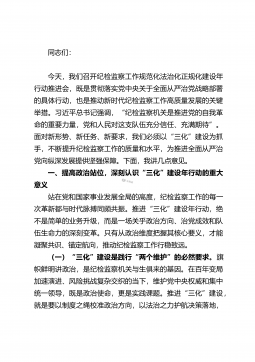 同志们:今天,我们召开纪检监察工作规范化法治化正规化建设年行动推进会,既是贯彻落实党中央关于全面从严治党战略部署的具体行动,也是推动新时代纪检监察工作高质量发展的关键举措。习近平总书记强调,“纪检监察机关是推进党的自我革命的重要力量,党和人民对这支队伍充分信任、充满期待”。面对新形势、新任务、新要求,我们必须以“三化”建设为抓手,不断提升纪检监察工作的质量和水平,为推进全面从严治党向纵深发展提供坚强保障。下面,我讲几点意见。一、提高政治站位,深刻认识“三化”建设年行动的重大意义站在党和国家事业发展全局的高度,纪检监察工作的每一次革新都与时代脉搏同频共振。推进“三化”建设年行动,绝不是简单的业务...