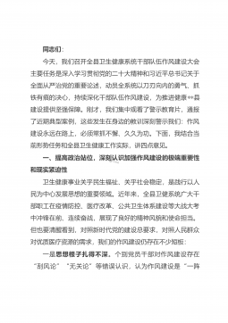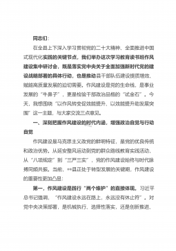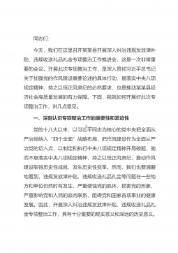 同志们:今天,我们在这里召开某某县开展深入纠治违规发放津补贴、违规收送礼品礼金专项整治工作推进会,这是一次非常重要的会议。开展此次专项整治工作,是深入贯彻习近平总书记关于加强党的作风建设重要论述的具体行动,是落实中央八项规定精神、持之以恒正风肃纪的必然要求,也是推动某某县经济社会高质量发展的有力保障。下面,我就如何开展好此次专项整治工作,讲几点意见。一、深刻认识专项整治工作的重要性和紧迫性党的十八大以来,以习近平同志为核心的党中央把全面从严治党纳入“四个全面”战略布局,把作风建设作为全面从严治党的切入点,以制定和执行中央八项规定精神开局破题,驰而不息落实中央八项规定精神,持之以恒正风肃纪,推动...
