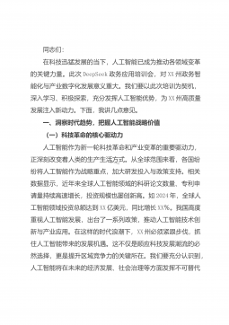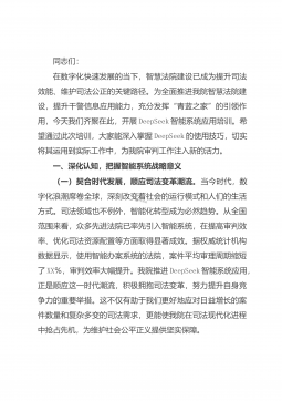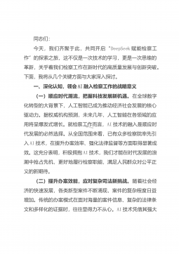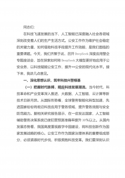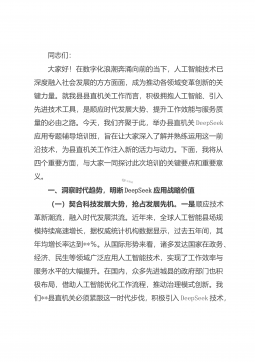 同志们:大家好!在数字化浪潮奔涌向前的当下,人工智能技术已深度融入社会发展的方方面面,成为推动各领域变革创新的关键力量。就我县县直机关工作而言,积极拥抱人工智能、引入先进技术工具,是顺应时代发展大势、提升工作效能与服务质量的必由之路。今天,我们齐聚于此,举办县直机关DeepSeek应用专题辅导培训班,旨在让大家深入了解并熟练运用这一前沿技术,为县直机关工作注入新的活力与动力。下面,我将从四个重要方面,与大家一同探讨此次培训的关键要点和重要意义。一、洞察时代趋势,明晰DeepSeek应用战略价值(一)契合科技发展大势,抢占发展先机。一是顺应技术革新潮流,融入时代发展洪流。近年来,全球人工智能县场...