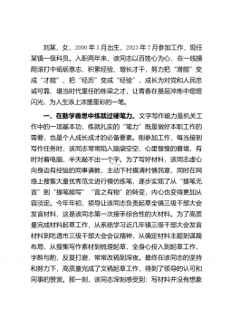 刘某,女,2000年3月出生,2023年7月参加工作,现任某镇一级科员。入职两年来,该同志以百姓心为心,在一线摸爬滚打中砥砺意志、积累经验、增长才干,努力把“潜能”变成“才能”、把“经历”变成“经验”,成长为对党和人民忠诚可靠、堪当时代重任的栋梁之才,让青春在基层淬炼中熠熠闪光,为人生添上浓墨重彩的一笔。一、在勤学善思中练就过硬笔力。文字写作能力是机关工作中的一项基本功,练就扎实的“笔力”既是做好本职工作的需要,也是个人成长成才的必备要素。刚参加工作,每当接到写作任务时,该同志常常陷入脑袋空空、心里惶惶的窘境,有时对着电脑,半天敲不出一个字。为了写好材料,该同志虚心向身边有经验的同事请教,主动...