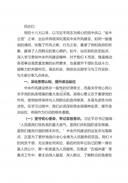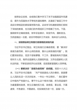 按照会议安排,会前我们集中学习了关于加强基层作风建设、提升为民服务水平等相关通知精神,还通报了基层工作中违反纪律规定的典型案例等内容。这些学习和通报使我们受到了深刻的教育,也为我们的市局组织工作明确了方向。下面,围绕树牢正确政绩观,树牢宗旨意识,转变作风、履职担当、为民造福这一主题,结合市局组织工作实际,我来谈几点体会。一、深刻领会树立和践行政绩观的深刻内涵习近平总书记指出,树立和践行正确政绩观,要“解决好政绩为谁而树、树什么样的政绩、靠什么树政绩的问题”。我们要深刻领会,党员干部做事情、干工作,要做到有利于国家、有利于人民,既符合国家和人民眼前利益,又符合国家和人民长远利益,不断促进经济社会...