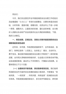 同志们:今天,我们在这里召开全市基层消防安全治理工作经验交流会暨遏制“小火亡人”专项行动部署会,主要任务是总结经验、分析形势,直面问题、部署任务,动员全市上下进一步统一思想、凝聚共力,以最坚决的态度、最扎实的举措,全力维护人民群众生命财产安全和我市社会大局的持续稳定。下面,我讲三点意见。一、肯定成绩、正视过往,深刻认识我市基层消防安全治理取得的阶段性成效近年来,在市委、市政府的坚强领导下,全市各地区、各部门、各单位坚持“人民至上、生命至上”理念,主动作为、勇于担当,推动我市基层消防安全治理工作取得了一系列积极进展,全市用火用电秩序持续向好,社会面火灾形势总体平稳。这些成绩的取得,是全市上下共同...
