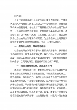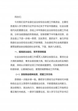 同志们:今天我们召开全县社会治安综合治理工作推进会,主要任务是深入学习贯彻习近平总书记关于平安中国建设、社会治理现代化的重要论述,总结上半年我县社会治安综合治理工作成效,分析当前面临的形势挑战,安排部署下半年重点任务,动员全县上下进一步统一思想、压实责任、真抓实干,奋力开创我县社会治安综合治理工作新局面,为全县经济社会高质量发展营造更加安全稳定的社会环境。下面,我讲六点意见。一、提高政治站位,筑牢思想根基社会治安综合治理工作事关人民群众安居乐业,事关社会大局和谐稳定,事关全县发展大局。我们必须从政治和全局的高度,深刻认识做好这项工作的极端重要性,切实增强责任感和使命感,以更高的站位、更宽的视野...