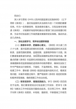 同志们:深入学习贯彻《中华人民共和国监察法实施条例》(以下简称《条例》),是纪检监察机关当前和今后一个时期的重要任务。作为一名常委领导,我深感责任重大。只有自身学深悟透《条例》,才能更好地指导和推动分管部门依法依规履行职责,为全市纪检监察工作高质量发展提供坚实保障。借此机会,谈几点体会。一、深化法规学习,筑牢依法履职根基(一)原原本本学,把握核心要义。《条例》共九章二百八十七条,是对监察法的细化和完善,内容涵盖监察机关及其职责、监察范围和管辖、监察权限、监察程序等各个方面。我们要逐章逐条逐句研读,深刻领会其精神实质和丰富内涵。要重点把握《条例》对监察机关职能定位、职责权限的明确规定,准确理解各...