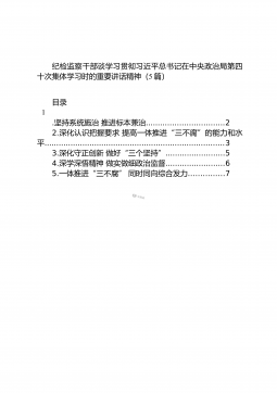 纪检监察干部谈学习贯彻习近平总书记在中央政治局第四十次集体学习时的重要讲话精神(5篇)目录1.坚持系统施治推进标本兼治.................................22.深化认识把握要求提高一体推进“三不腐”的能力和水平............................................................................33.深化守正创新做好“三个坚持”.........................54.深学深悟精神做实做细政治监督.........................65.一体推进“三不腐”同时同向综合发力...