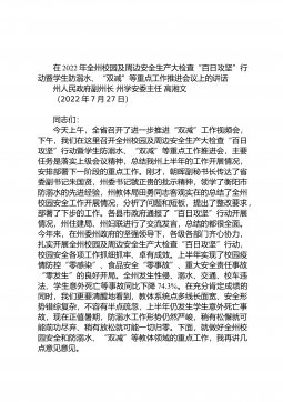 在2022年全州校园及周边安全生产大检查“百日攻坚”行动暨学生防溺水、“双减”等重点工作推进会议上的讲话州人民政府副州长州学安委主任高湘文(2022年7月27日)同志们:今天上午,全省召开了进一步推进“双减”工作视频会,下午,我们在这里召开全州校园及周边安全生产大检查“百日攻坚”行动暨学生防溺水、“双减”等重点工作推进会,主要任务是落实上级会议精神,总结我州上半年的工作开展情况,安排部署下一阶段的重点工作。刚才,朝晖副秘书长传达了省委副书记朱国贤,州委书记虢正贵的批示精神,领学了衡阳市防溺水的先进经验,州教体局田勇同志客观实在的总结了全州校园安全工作开展情况,分析了问题和短板,提出了整改要求,...