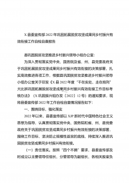 X县委宣传部2022年巩固拓展脱贫攻坚成果同乡村振兴有效衔接工作自检自查报告县巩固脱贫攻坚推进乡村振兴领导小组办公室:为深入贯彻落实党中央、国务院及省、州、县党委政府关于巩固拓展脱贫攻坚成果同乡村振兴有效衔接的决策部署,扎实高效推进各项工作,根据县巩固脱贫攻坚推进乡村振兴领导小组办公室关于印发《X县2022年度“干在实处,走在前列”大比拼巩固拓展脱贫攻坚成果同乡村振兴有效衔接工作目标考核办法》(X巩固振兴组办发〔2022〕12号)的通知要求,现将县委宣传部2022年工作自检自查情况报告如下:一、围绕目标,强化落实2022年以来,县委宣传部以XJP新时代中国特色社会主义思想为指导,认真贯彻落实党...