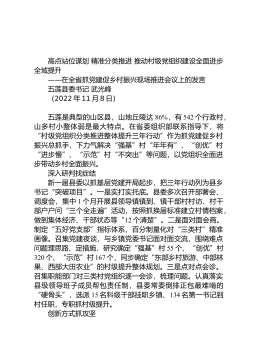 高点站位谋划精准分类推进推动村级党组织建设全面进步全域提升——在全省抓党建促乡村振兴现场推进会议上的发言五莲县委书记武光峰(2022年11月8日)五莲是典型的山区县,山地丘陵达86%,有542个行政村,山多村小整体弱是最大特点。在省委组织部联系指导下,将“村级党组织分类推进整体提升三年行动”作为抓党建促乡村振兴总抓手,下力气解决“强基”村“年年有”、“创优”村“进步慢”、“示范”村“不突出”等问题,以党组织全面进步带动乡村全面振兴。深入研判找症结新一届县委以抓基层党建开局起步,把三年行动列为县乡书记“突破项目”。一是实打实托底。县委多次召开部署会、调度会,集中1个月开展县领导镇镇到、镇干部村村...