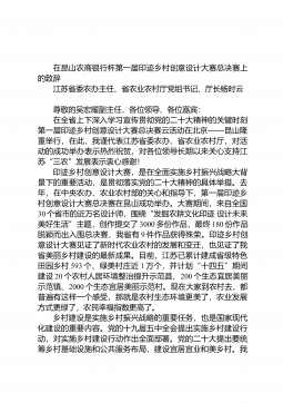 在昆山农商银行杯第一届印迹乡村创意设计大赛总决赛上的致辞江苏省委农办主任、省农业农村厅党组书记、厅长杨时云尊敬的吴宏耀副主任,各位领导、各位嘉宾:在全省上下深入学习宣传贯彻党的二十大精神的关键时刻第一届印迹乡村创意设计大赛总决赛云活动在北京——昆山隆重举行,在此,我谨代表江苏省委农办、省农业农村厅,对活动的成功举办表示热烈祝贺,对各位领导长期以来关心支持江苏“三农”发展表示衷心感谢!印迹乡村创意设计大赛,是在全面实施乡村振兴战略大背景下的重要活动,是贯彻落实党的二十大精神的具体举措。去年,在中央农办、农业农村部的关心和指导下,第一届印迹乡村创意设计大赛总决赛在昆山成功举办。大赛期间,来自全国3...