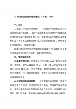 XX单位基层党组织建设标准,9方面、33项! 一、总则1.根据《中国共产党章程》、《中国共产党党和国家机关基层组织工作条例》、《关于在推进事业单位改革中加强和改进党的建设工作的意见》和中央、省委相关文件精神以及省委组织部《关于推进基层党组织标准化建设的意见》,结合省直机关实际情况,制定本标准。2.本标准适用范围是党组织关系隶属于XX省直机关工委的省直及中央驻皖各级机关、事业单位党组织。二、党的组织设置3.基本设置形式:正式党员人数达到3人以上的设立党支部;原则上,党员人数超过50人、不足100人的设立党总支;党员人数达100人以上的设立党委。党员不足前述人数条件的,因工作需要,经上级党组织批准...