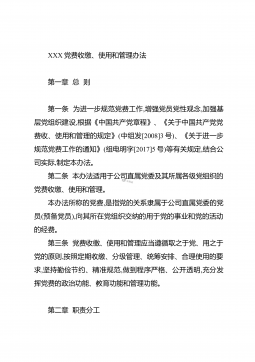 XXX党费收缴、使用和管理办法第一章总则第一条为进一步规范党费工作,增强党员党性观念,加强基层党组织建设,根据《中国共产党章程》、《关于中国共产党党费收、使用和管理的规定》(中组发[2008]3号)、《关于进一步规范党费工作的通知》(组电明字[2017]5号)等有关规定,结合公司实际,制定本办法。第二条本办法适用于公司直属党委及其所属各级党组织的党费收缴、使用和管理。本办法所称的党费,是指党的关系隶属于公司直属党委的党员(预备党员),向其所在党组织交纳的用于党的事业和党的活动的经费。第三条党费收缴、使用和管理应当遵循取之于党、用之于党的原则,按照定期收繳、分级管理、统筹安排、合理使用的要求,坚...