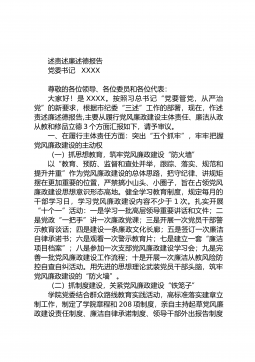 述责述廉述德报告党委书记XXXX尊敬的各位领导、各位委员和各位代表:大家好!是XXXX。按照习总书记“党要管党,从严治党”的新要求,根据市纪委“三述”工作的部署,现在,作述责述廉述德报告,主要从履行党风廉政建设主体责任、廉洁从政从教和修品立德3个方面汇报如下,请予审议。一、在履行主体责任方面:突出“五个抓牢”,牢牢把握党风廉政建设的主动权(一)抓思想教育,筑牢党风廉政建设“防火墙”以“教育、预防、监督和查处并举,跟踪、落实、规范和提升并重”作为党风廉政建设的总体思路,把守纪律、讲规矩摆在更加重要的位置,严禁搞小山头、小圈子,旨在占领党风廉政建设思想意识形态高地。健全学习教育制度,规定每月的干部...