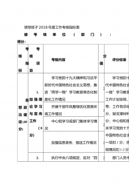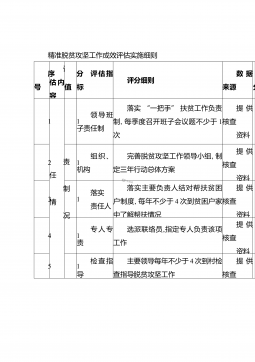 精准脱贫攻坚工作成效评估实施细则序号评估内容分值评估指标评分细则数据来源分1责任制情况1领导班子责任制落实“一把手”扶贫工作负责制,每季度召开班子会议题不少于1次提供核查资料21组织、机构完善脱贫攻坚工作领导小组,制定三年行动总体方案提供核查资料31落实责任人落实主要负责人结对帮扶贫困户制度,每年不少于4次到贫困户家中了解帮扶情况提供核查资料41专人专责选派联络员,指定专人负责该项工作提供核查资料51检查指导主要领导每年不少于4次到村检查指导脱贫攻坚工作提供核查6精准识别辖区内情况3相对贫困户人口自然减少、增加变动情况贫困人口自然减少、增加没有及时操作的不得分。现场核实73扶贫档案管理情况1....