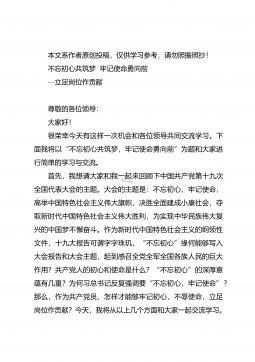 本文系作者原创投稿,仅供学习参考,请勿照搬照抄!不忘初心共筑梦牢记使命勇向前—立足岗位作贡献尊敬的各位领导:大家好!很荣幸今天有这样一次机会和各位领导共同交流学习。下面我将以“不忘初心共筑梦,牢记使命勇向前”为题和大家进行简单的学习与交流。首先,我想请大家和我一起来回顾下中国共产党第十九次全国代表大会的主题。大会的主题是:不忘初心,牢记使命,高举中国特色社会主义伟大旗帜,决胜全面建成小康社会,夺取新时代中国特色社会主义伟大胜利,为实现中华民族伟大复兴的中国梦不懈奋斗。作为新时代中国特色社会主义的纲领性文件,十九大报告可谓字字珠玑,“不忘初心”缘何能够写入大会报告和大会主题,起到感召全党全军全国...