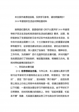 本文系作者原创投稿,仅供学习参考,请勿照搬照抄!2018年度民主生活会个人对照检查材料根据本次民主生活会的要求,结合自身的思想、工作实际对照党员标准深刻剖析自身存在的问题,以此来促进自身思想和工作的进步,现将对照检查情况汇报如下,希望同志们对我给予帮助。一、深入查摆突出问题(一)政治思想方面。能够主动学习贯彻习近平新时代中国特色社会主义思想,牢固树立“四个意识”,坚定“四个自信”,做到“四个服从”,坚决维护习近平总书记在党中央和全党的核心地位、维护党中央权威和集中统一领导,自觉在思想上政治上行动上同以习近平同志为核心的党中央保持高度一致。但是还是存在着一些不足之处:一是思想上不够重视,缺乏主动...