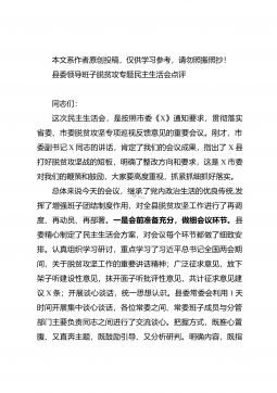 本文系作者原创投稿,仅供学习参考,请勿照搬照抄!县委领导班子脱贫攻专题民主生活会点评同志们:这次民主生活会,是按照市委《X》通知要求,贯彻落实省委、市委脱贫攻坚专项巡视反馈意见的重要会议。刚才,市委副书记X同志的讲话,肯定了我们的会议成果,指出了X县打好脱贫攻坚战的短板,明确了整改方向和要求,这是X市委对我们的鞭策和鼓励,大家要高度重视,抓紧抓细抓好落实。总体来说今天的会议,继承了党内政治生活的优良传统,发挥了增强班子团结制度作用,对全县脱贫攻坚工作进行了再调度、再动员、再部署。一是会前准备充分,做细会议环节。县委精心制定了民主生活会方案,对会议每个环节都做了细致安排。认真组织学习研讨,重点学...