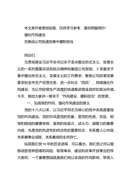 本文系作者原创投稿,仅供学习参考,请勿照搬照抄!强化作风建设在推动公司快速发展中履职担当同志们:为贯彻落实习近平总书记关于坚决整治形式主义、官僚主义的一系列重要讲话和批示精神和集团公司党组、X党委关于集中整治形式主义、官僚主义的工作要求,聚焦公司改革发展要求和全年生产经营任务,进一步纠正“四风”,持续强化作风建设,为公司经营生产进度的快速推进营造良好的政治环境。今天,我给大家讲一堂关于“作风建设,履职担当”的党课。一、弘扬党的作风,强化作风建设的意义党的十八大以来,以习近平同志为核心的党中央高度重视党的作风建设。党的作风是党的形象,是党的性质、宗旨、纲领和路线的重要体现,是党的创造力、战斗力、...