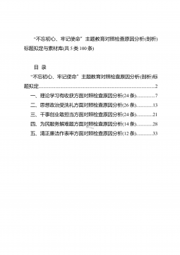 “不忘初心、牢记使命”主题教育对照检查原因分析(剖析)标题拟定与素材库(共5类100条)目录“不忘初心、牢记使命”主题教育对照检查原因分析(剖析)标题拟定................................................................................................2一、理论学习有收获方面对照检查原因分析(24条)...............7二、思想政治受洗礼方面对照检查原因分析(26条).............13三、干事创业敢担当方面对照检查原因分析(24条).............21四、为民服务解难...