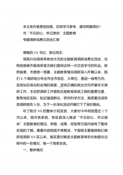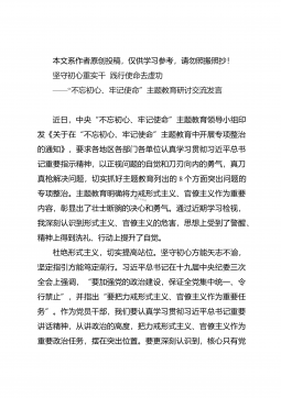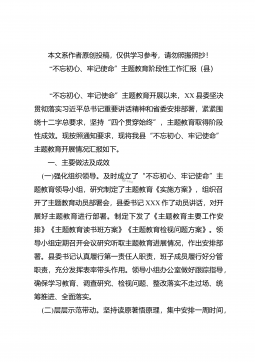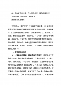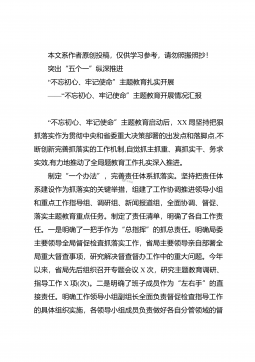 本文系作者原创投稿,仅供学习参考,请勿照搬照抄!突出“五个一”纵深推进“不忘初心、牢记使命”主题教育扎实开展——“不忘初心、牢记使命”主题教育开展情况汇报“不忘初心、牢记使命”主题教育启动后,XX局坚持把狠抓落实作为贯彻中央和省委重大决策部署的出发点和落脚点,不断创新完善抓落实的工作机制,自觉抓主抓重、真抓实干、务求实效,有力地推动了全局题教育工作扎实深入推进。制定“一个办法”,完善责任体系抓落实。坚持把责任体系建设作为抓落实的关键举措,组建了工作协调推进领导小组和重点工作指导组、调研组、新闻报道组,全面协调、督促、落实主题教育重点任务。制定了责任清单,明确了各自工作责任。一是明确了一把手作为...