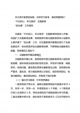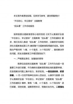 本文系作者原创投稿,仅供学习参考,请勿照搬照抄!“不忘初心、牢记使命”主题教育“回头看”工作总结报告 按照县委主题教育领导小组印发的《关于认真做好全县“不忘初心、牢记使命”主题教育“回头看”工作的通知》要求,我们在深入推进“回头看”工作的同时,注重抓好巩固和深化主题教育成果工作,确保整个主题教育取得最好成效。现将我办严格对照“6看、19个是否、26个有没有”,查找解决存在问题,抓实主题教育工作情况报告如下:一、严格落实责任,加强组织领导 我单位自觉将主题教育“回头看”工作作为当前一项重要工作进行部署,作为确保主题教育取得实效的重要举措,在发现解决问题上集中发力、务求实效。一是迅速安排,抓紧...