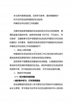 本文系作者原创投稿,仅供学习参考,请勿照搬照抄!关于召开党支部专题组织生活会和开展民主评议党员工作的通知为更好地发挥专题组织生活会和民主评议在党员教育、管理和监督方面的作用,按照学校党委《关于在“不忘初心、牢记使命”主题教育中召开专题组织生活会和开展民主评议党员的通知》文件要求,现就机关各党支部召开专题组织生活会和开展民主评议党员工作安排通知如下:一、参加人员和范围专题组织生活会和民主评议党员工作以党支部为单位进行具体由各党支部组织进行,支部全体党员必须参加。党员领导干部要落实双重组织生活制度,以普通党员身份参加所在党支部的专题组织生活会。参加年度民主生活会的党员领导干部,可不参加民主评议党员...