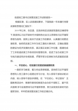街道党工委书记党管武装工作述职报告一根据区委、区人武部通知要求,下面我就一年来履行党管武装职责情况汇报如下:2019年以来,在区委、区政府和区武装部党委的正确领导下,我坚持以习近平新时代中国特色社会主义思想和习近平强军思想为指导,按照上级关于武装工作的要求,认真履行党管武装职责,始终把武装工作作为党工委的大事来抓,正确处理国防建设与经济发展的关系,真正摆正武装工作位置,圆满完成了工农街道武装工作各项目标管理任务,促进了全办武装工作与地方建设同步协调发展,并被市军分区表彰为先进基层武装部。一、不忘初心,切实履行党管武装重要职责一是抓学习教育,着力夯实思想根基。坚持把习近平强军思想列入党工委中心...