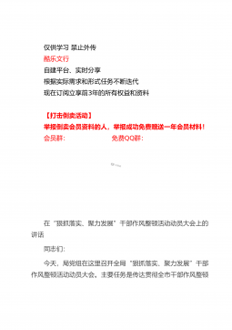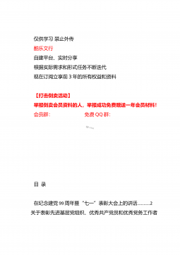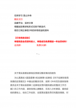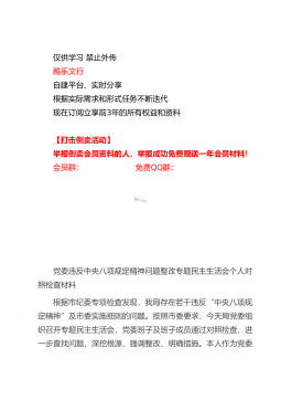 仅供学习禁止外传酷乐文行自建平台、实时分享根据实际需求和形式任务不断迭代现在订阅立享前3年的所有权益和资料【打击倒卖活动】举报倒卖会员资料的人,举报成功免费赠送一年会员材料!会员群:免费QQ群:党委违反中央八项规定精神问题整改专题民主生活会个人对照检查材料根据市纪委专项检查发现,我局存在若干违反“中央八项规定精神”及市委实施细则的问题。按照市委要求,今天局党委组织召开专题民主生活会,党委班子及班子成员通过对照检查,进一步查找问题、深挖根源、强调整改、明确措施。本人作为党委主要责任人,在民主生活会前,通过认真反思、全面学习、反复研讨、谈心谈话、征求意见,进行个人对照检查,现将对照检查情况报告如下...