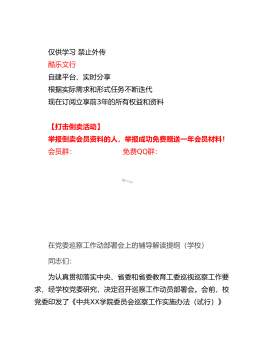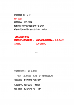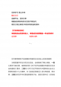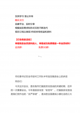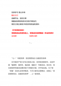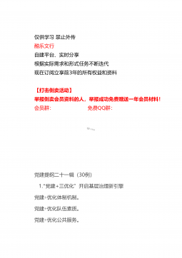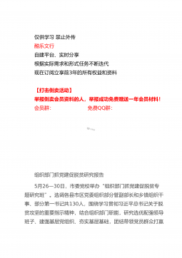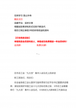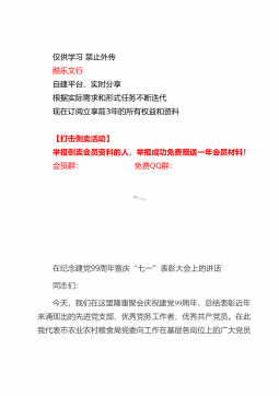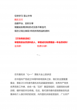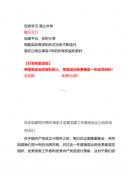 仅供学习禁止外传酷乐文行自建平台、实时分享根据实际需求和形式任务不断迭代现在订阅立享前3年的所有权益和资料【打击倒卖活动】举报倒卖会员资料的人,举报成功免费赠送一年会员材料!会员群:免费QQ群:在庆祝建党99周年表彰大会暨党建工作推进会议上的讲话同志们:在中国共产党成立99周年之际,我们在这里隆重集会,共同回顾我们党99年的光辉历程,对过去一年里涌现出的优秀基层党组织、优秀党务工作者和优秀共产党员进行表彰,这对于我们进一步牢记党的光辉历史,发扬党的优良传统,推进党的建设和XXX事业的发展进步,都具有十分重要的现实意义。在此,我谨代表XXX党委,向广大党员致以节日的问候!向新吸收的党员和受到表彰...