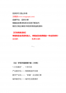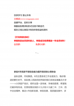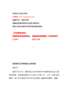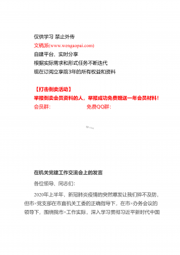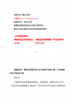 仅供学习禁止外传文稿派(www.wengaopai.com)自建平台、实时分享根据实际需求和形式任务不断迭代现在订阅立享前3年的所有权益和资料【打击倒卖活动】举报倒卖会员资料的人,举报成功免费赠送一年会员材料!会员群:免费QQ群:专题党课:锲而不舍抓作风永不放松严党纪做一个弘扬新风正气的好干部同志们:干部的作风关系着党风政风。这段时间,我通过深入学习《习近平谈治国理政》第三卷,对习总书记关于各级干部的生作风建设的论述进行深入研读。今天这堂党课,我主要是围绕这一话题,与大家做一次交流。一、《习近平谈治国理政》第三卷有关作风建设的重要论述全面从严治党永远在路上,不能有任何喘口气、歇歇脚的念头。我们...