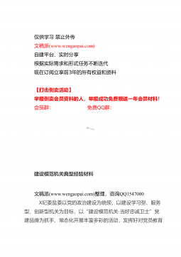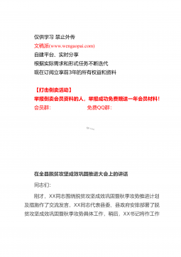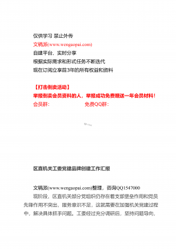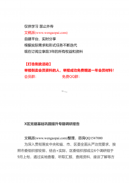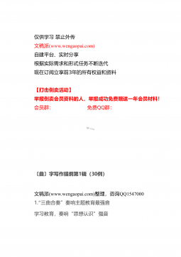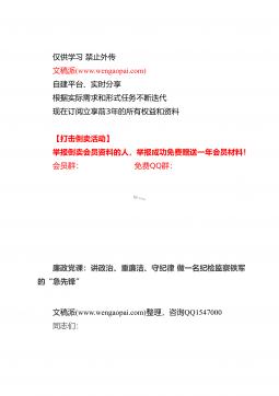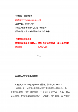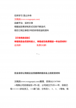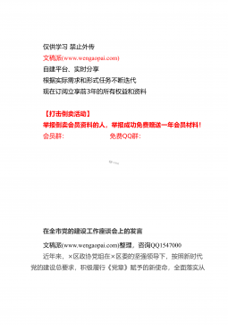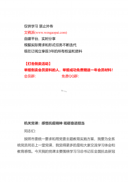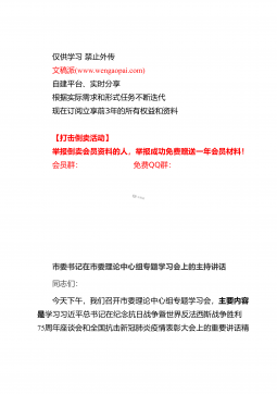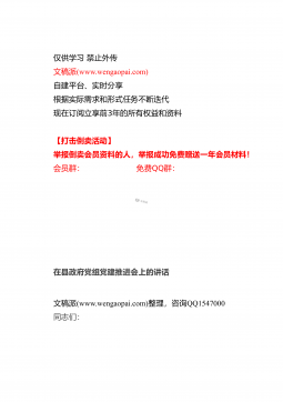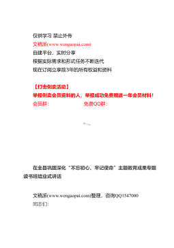 仅供学习禁止外传文稿派(www.wengaopai.com)自建平台、实时分享根据实际需求和形式任务不断迭代现在订阅立享前3年的所有权益和资料【打击倒卖活动】举报倒卖会员资料的人,举报成功免费赠送一年会员材料!会员群:免费QQ群:县委书记在全县巩固深化“不忘初心、牢记使命”主题教育成果专题读书班开班仪式上的动员讲话文稿派(www.wengaopai.com)整理,咨询QQ1547000同志们:近日,中共中央办公厅印发了《关于巩固深化“不忘初心、牢记使命”主题教育成果的意见》,并发出通知,要求各地区各部门结合实际认真贯彻落实。县委迅速响应、及时跟进,谋划举办了这次为期×天,实行集中封闭管理的专题...