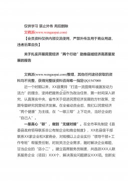 仅供学习禁止外传用后删除文稿派(www.wengaopai.com)【会员资料仅供内部交流使用,严禁外传及用于商业用途,违者后果自负】关于扎实开展民营经济“两个行动”助推县域经济高质量发展的报告文稿派(www.wengaopai.com)整理,其他任何途径获取的资料均不完整,获得完整版资料咨询唯一指定QQ1547000近一个时期以来,XX县秉持“打造一流营商环境激发动力活力”的理念,坚持把服务企业作为政治任务,第一时间深入研究、认真落实中央、省市关于促进民营经济发展的方针政策,定期专题研究民营经济发展。在全省动员会后,我们以民营经济“两个健康”为主线,在“一联三帮”上下功夫,当好企业的“自己人...