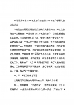 XX城管局长在2014年度工作总结暨2015年工作部署大会上的讲话今天的会议是经过局党组反复研究决定召开的。开这次会有三个主要任务:一是总结2014年度的工作,目的是看到我们的优点,同时看到我们的不足,使我们更进一步奋发有为;二是表彰2014年度工作中做出了优异成绩、各方面表现突出的单位和个人,另外还有一个文明创建的单项表彰,因为文明创建是去年的重要工作,全国文明城市创建夺得金字招牌,我们功不可没;三是认清2015年的工作怎么搞,只有看得清楚、想得清楚、说得清楚,才干得清楚,在这个思想观念上指导我们的工作。我从去年12月29日到城管局后,做了大量的调查研究,工作思路只要不离不开主线,主心不偏离...