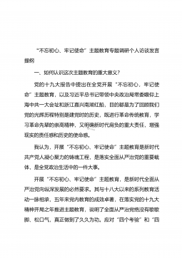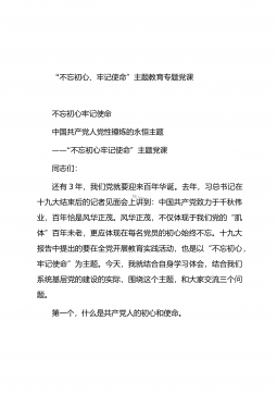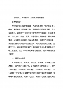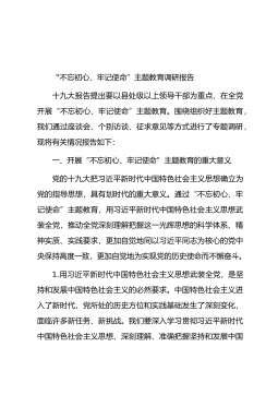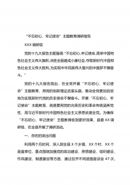 “不忘初心、牢记使命”主题教育调研报告XXX调研组党的十九大报告主题强调:“不忘初心,牢记使命,高举中国特色社会主义伟大旗帜,决胜全面建成小康社会,夺取新时代中国特色社会主义伟大胜利,为实现中华民族伟大复兴的中国梦不懈奋斗。”党的十九大报告指出,在全党开展“不忘初心、牢记使命”主题教育,用党的创新理论武装头脑,推动全党更加自觉地为实现新时代党的历史使命不懈奋斗。开展“不忘初心、牢记使命”主题教育,就是要用党的光荣历史和革命传统涵养党性、用习近平新时代中国特色社会主义思想武装全党。为确保“不忘初心、牢记使命”主题教育收到更好效果,县委XX调研组,在全县开展了调研活动。一、存在的突出问题利用两个月...