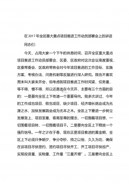 在2017年全区重大重点项目推进工作动员部署会上的讲话同志们:今天,占用大家一个下午的休息时间,召开全区重大重点项目推进工作动员部署会,区委、区政府对这次会议高度重视,区委常委会、区政府常务会对今年项目推进的工作目标、实施方案、考核办法、问责机制等反复进行深入研究。我也不喜欢周末叫大家来开会,但考虑到项目推进工作时间紧、任务重,等不得、慢不得,所以还是选在今天开,主要有三个方面的目的:一是要向全区上下传递一个重要导向。我多次讲过,今年的工作成也项目、败也项目,缺少项目,经济增长就会成为无源之水,加快发展就会成为无本之木。全区上下要进一步树立发展至上、项目至重、客商至尊的理念,一切围着项目想,一...