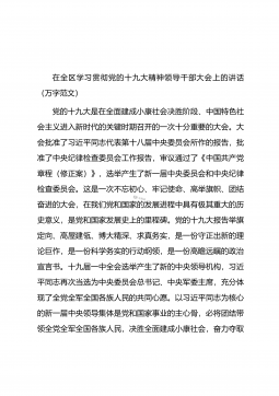 在全区学习贯彻党的十九大精神领导干部大会上的讲话(万字范文)党的十九大是在全面建成小康社会决胜阶段、中国特色社会主义进入新时代的关键时期召开的一次十分重要的大会。大会批准了习近平同志代表第十八届中央委员会所作的报告,批准了中央纪律检查委员会工作报告,审议通过了《中国共产党章程(修正案)》,选举产生了新一届中央委员会和中央纪律检查委员会。这是一次不忘初心、牢记使命、高举旗帜、团结奋进的大会,在我们党和国家的发展进程中具有极其重大的历史意义,是党和国家发展史上的里程碑。党的十九大报告举旗定向、高屋建瓴、博大精深、求真务实,是一份守正出新的理论巨作,是一份科学务实的行动纲领,是一份高瞻远瞩的政治宣言...