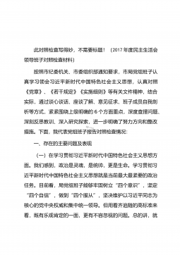 此对照检查写得妙,不需要标题!(2017年度民主生活会领导班子对照检查材料)按照市纪委机关、市委组织部通知要求,市局党组班子认真学习领会习近平新时代中国特色社会主义思想,认真对照《党章》、《若干规定》《实施细则》等有关文件精神,结合实际,通过谈心谈话、座谈了解、意见征求、班子成员自我剖析等方式,紧紧围绕上级明确的6个方面重点,深度查摆问题、深刻反思教训、深入研究探索,进一步明确了努力方向和整改措施。下面,我代表党组班子报告对照检查情况:一、存在的主要问题及表现(一)在学习贯彻习近平新时代中国特色社会主义思想方面。我们感到,政治是灵魂,是统帅,更是生命。学习贯彻习近平新时代中国特色社会主义思想就...