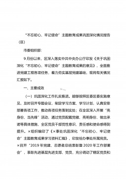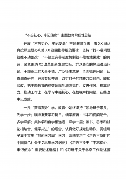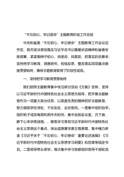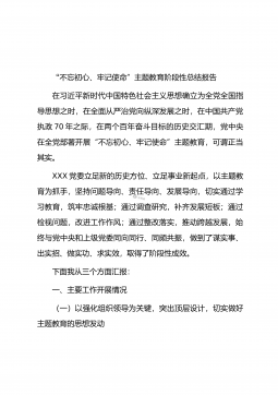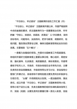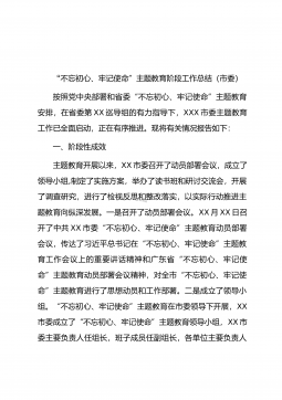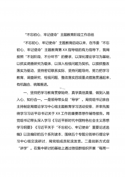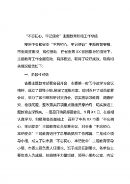 “不忘初心、牢记使命”主题教育阶段工作总结(市委)按照党中央部署和省委“不忘初心、牢记使命”主题教育安排,在省委第XX巡导组的有力指导下,XXX市委主题教育工作已全面启动,正在有序推进。现将有关情况报告如下:一、阶段性成效主题教育开展以来,XX市委召开了动员部署会议,成立了领导小组,制定了实施方案,举办了读书班和研讨交流会,开展了调查研究,进行了检视反思和整改落实,以实际行动推进主题教育向纵深发展。一是召开了动员部署会议。XX月XX日召开了中共XX市委“不忘初心、牢记使命”主题教育动员部署会议,传达了习近平总书记在“不忘初心、牢记使命”主题教育工作会议上的重要讲话精神和广东省“不忘初心、牢记使...