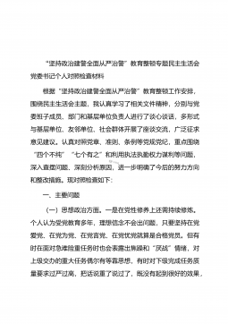 “坚持政治建警全面从严治警”教育整顿专题民主生活会党委书记个人对照检查材料根据“坚持政治建警全面从严治警”教育整顿工作安排,围绕民主生活会主题,我认真学习了相关文件精神,分别与党委班子成员、部门和基层单位负责人进行了谈心谈话,多形式与基层单位、友邻单位、社会群体开展了座谈交流,广泛征求意见建议。认真对照党章、准则、条例等党规党纪,重点围绕“四个不纯”“七个有之”和利用执法执勤权力谋利等问题,深入查摆问题、深刻分析原因,进一步明确了今后的努力方向和整改措施。现对照检查如下:一、主要问题(一)思想政治方面。一是在党性修养上还需持续修炼。个人认为受党教育多年,理想信念不会出问题,只要坚持在党爱党、在...
